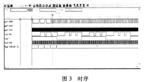 筆者用MaxPlus II對(duì)以上設(shè)計(jì)進(jìn)行仿真后得到圖3所示的時(shí)序圖,完全滿足設(shè)計(jì)要求,從圖3可以看出串行輸入的數(shù)據(jù)(shiflin)變成并行的數(shù)據(jù)(shiftout) 輸出,在此過程中數(shù)據(jù)延時(shí)8個(gè)周期,每個(gè)txts的上升沿提取數(shù)據(jù)能保證數(shù)據(jù)的正確性。因?yàn)閺臄?shù)據(jù)的變動(dòng)到txts的上升沿有400ns,大于FPGA的數(shù)據(jù)建立時(shí)間(25ns~50ns),可以保證提取數(shù)據(jù)的正確性。