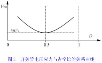 上式說明,當(dāng)變壓器匝比愈小時(shí),對(duì)于一定的輸入電壓和輸出電壓的變換器,開關(guān)管電壓應(yīng)力vds愈小。所以,有源鉗位正激變換器一個(gè)顯著優(yōu)點(diǎn)是可以降低開關(guān)管電壓應(yīng)力,從而可選用額定電壓較低、通態(tài)電阻較小的功率開關(guān)管。另外,當(dāng)變壓器變比n確定后,開關(guān)管電壓應(yīng)力僅與占空比有關(guān),如圖3所示。顯然,當(dāng)占空比為0.5時(shí),開關(guān)管承受最小的電壓應(yīng)力。當(dāng)輸入電壓變化時(shí),如果將占空比設(shè)計(jì)運(yùn)行在以0.5為中心的對(duì)稱范圍內(nèi),則可使開關(guān)管承受的電壓應(yīng)力基本保持恒定。
