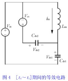 當(dāng)輔助開關(guān)sa斷開后,由于磁飽和電感l(wèi)s瞬間相當(dāng)于開路,因此變壓器勵(lì)磁電流可完全用來對(duì)cds2和cds1充放電。[t4~t5]、[t5~t0′]期間,等效電路同圖4。顯然,令式(21)和(24)中io*或io為零,即可得到主開關(guān)管零電壓導(dǎo)通的能量條件和時(shí)間條件,im(max)≥cdsωvin,即: