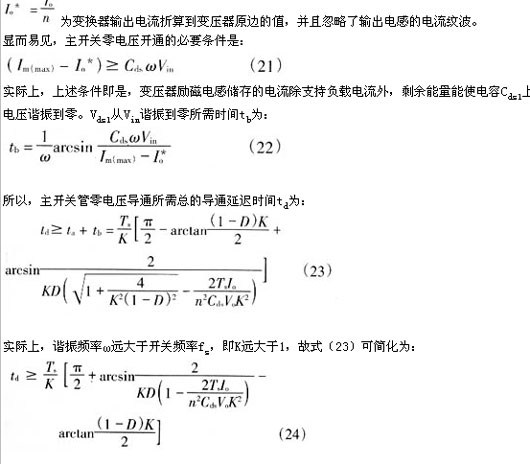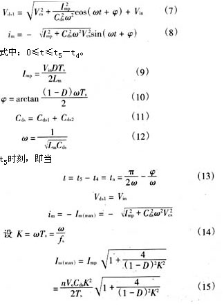從上面的分析可明顯地看出,當(dāng)變壓器勵(lì)磁電感l(wèi)m減小,勵(lì)磁電流足夠大時(shí),[t5~t0′]期間勵(lì)磁電流除了能提供負(fù)載電流外,剩余部分可用來幫助電容cds2、cds1充放電。電壓vds1有可能諧振到零,從而實(shí)現(xiàn)主功率開關(guān)管s的零電壓軟開通。二極管d1可為負(fù)的勵(lì)磁電流續(xù)流。關(guān)鍵工作波形如圖2(b)所示,具體的軟開關(guān)條件將在下一節(jié)中詳細(xì)討論。很顯然,軟開關(guān)的代價(jià)是變壓器勵(lì)磁電流和開關(guān)管導(dǎo)通電流峰值大幅增加,開關(guān)管及變壓器電流應(yīng)力和通態(tài)損耗明顯加大。
