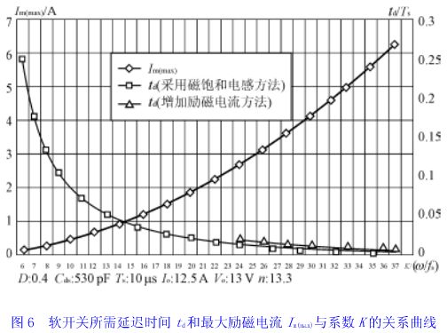死區(qū)延遲時(shí)間,意味著pwm變換器有效占空比的損失。為了盡量減小有效占空比的損失,則k必須加大。另一方面,變換器開關(guān)頻率fs愈高,則為保持相同的有效占空比,k至少應(yīng)保持不變,即諧振頻率ω應(yīng)與開關(guān)頻率fs成比例增加。圖6給出了軟開關(guān)所需要的死區(qū)時(shí)間td和最大勵(lì)磁電流im(max)與k的關(guān)系曲線。從圖中明顯看出,采用加大勵(lì)磁電流的方法實(shí)現(xiàn)零電壓軟開關(guān)和采用磁飽和電感器比較,要求的k較大,因而有較大的勵(lì)磁電流損耗;另外,從式(15)看出,開關(guān)頻率愈高,電流峰值也愈高,變壓器的銅耗和開關(guān)管的導(dǎo)通損耗也愈大。因此,軟開關(guān)有源鉗位正激變換器工作頻率不宜太高。