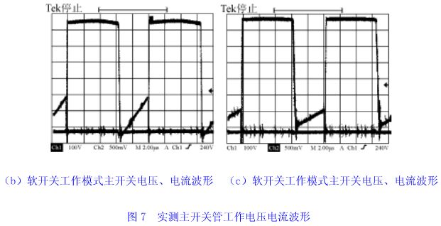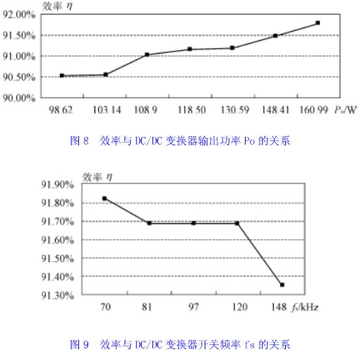 圖7(a)、7(b)、7(c)給出了實(shí)測(cè)的主開關(guān)管工作電壓、電流波形。圖7(a)顯示主開關(guān)管工作在硬開關(guān)狀態(tài)。圖7(b)和圖7(c)分別是采用增加勵(lì)磁電流方法和應(yīng)用磁飽和電感器方法實(shí)現(xiàn)零電壓軟開關(guān)的電壓電流波形,后者明顯地降低了勵(lì)磁電流和開關(guān)管電流的峰值。實(shí)測(cè)波形與理論分析完全一致。圖8、9顯示出了實(shí)測(cè)的效率曲線。從圖9中看出,當(dāng)變換器開關(guān)頻率增加時(shí),變壓器勵(lì)磁電流損耗和開關(guān)管通態(tài)損耗所占比重增加,變換器效率降低了。實(shí)驗(yàn)結(jié)果驗(yàn)證了理論分析。