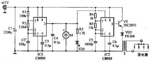 IC1、IC2選用兩塊時基電路CB555,或選用一塊雙時基電路CB556。注意,CMOS時基電路CB7555或CB7556因驅(qū)動電流較小,不適合本機使用。開關(guān)管VT選用2SC2073等中功率管。二極管VD2選用FR104等快恢復整流管。風扇M可選用12V、150mA左右的計算機CPU用的散熱風扇,其體積較小、厚度薄、噪聲很低,比較適合本制作使用,也可用12V玩具電機配以自制的風扇葉片代用。