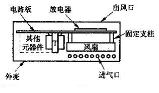 風扇M固定在電路板下方,風扇中心正對著放電器,相距15mm左右。風扇的出風方向應(yīng)朝上,以便將放電器產(chǎn)生的負離子向上吹到空氣中。整機應(yīng)裝入絕緣外殼中,在外殼上面正對放電器的位置開一些孔縫作為出風口,在外殼兩側(cè)靠近風扇的地方開孔作為進氣口。12V電源線與汽車點煙器插頭相連接。