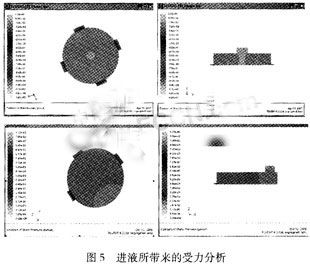 檢測過程中應(yīng)考慮液體輸入微反應(yīng)室時對工作電極表面敏感膜及室壁產(chǎn)生的力的作用,因為力的作用不當會產(chǎn)生敏感膜脫落的現(xiàn)象。實驗過程中通過合理地設(shè)計選擇進液口位置來優(yōu)化力的分布,減少對敏感膜表面產(chǎn)生的沖擊。在設(shè)計的4種結(jié)構(gòu)中,對進液口位置的選擇分成中心處和邊緣處兩種,兩種結(jié)構(gòu)的壓力分布圖對比如圖5所示。在進液管道附近,液體產(chǎn)生較大的力的作用,而將進液口從反應(yīng)區(qū)域正上方移至邊緣處,其產(chǎn)生的力會在中心敏感區(qū)域外圍被電極周邊區(qū)域和富有彈性的PDMS室壁緩沖而減弱,不會影響到敏感膜生成區(qū)域,較好地解決了進出液對敏感膜可能造成的損害問題;而在中心開口的兩種結(jié)構(gòu)位于敏感反應(yīng)區(qū)上方,如圖可見試劑輸人時會有力作用于中心處,特別是當液體輸入速度較高時,會對敏感膜造成損傷。