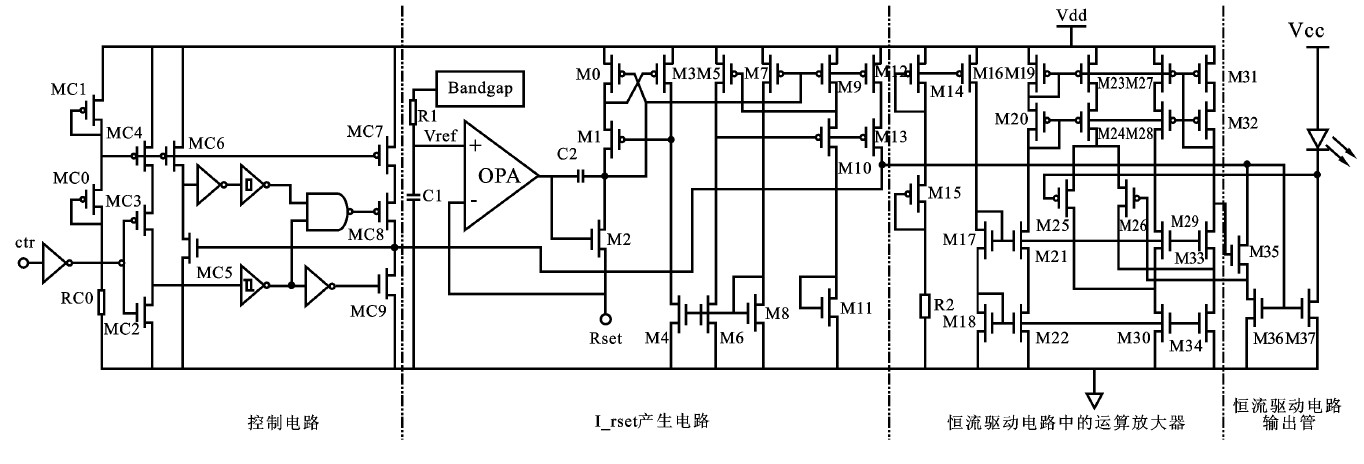 整個控制模塊利用施密特觸發(fā)器實(shí)現(xiàn)電平的準(zhǔn)確翻轉(zhuǎn),通過邏輯門作用于MC8、MC9.這兩個MOS管在控制信號發(fā)生翻轉(zhuǎn)時迅速將電平拉高或拉低,實(shí)現(xiàn)了對控制信號控制功能的加速作用,電路的響應(yīng)速度快。當(dāng)ctr信號為高時輸出禁止,ctr信號為低時輸出允許,從而實(shí)現(xiàn)利用外部的PWM信號實(shí)現(xiàn)調(diào)光功能。I_rset產(chǎn)生電路要實(shí)現(xiàn)通過外設(shè)電阻Rset對I_rest大小的控制,并且對與固定的Rset可以恒流輸出。利用帶隙電壓源產(chǎn)生一個基準(zhǔn)電壓,利用運(yùn)放實(shí)現(xiàn)基準(zhǔn)電壓到基準(zhǔn)電流的轉(zhuǎn)換。將運(yùn)放的反相端連接到外設(shè)電阻Rset就實(shí)現(xiàn)了轉(zhuǎn)換的電流大小受控于Rset.通過后續(xù)電路將電流適當(dāng)放大,最終給出I_rset.總體電路利用確立好的恒流驅(qū)動模塊實(shí)現(xiàn)恒流輸出。
