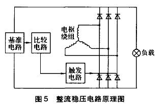 設(shè)計(jì)的釹鐵硼永磁發(fā)電裝置結(jié)構(gòu)示意圖如圖4所示,還研制了三相半控橋整流穩(wěn)壓電路(圖5)。該電路由三相半控橋整流電路、電壓信號(hào)取樣電路和觸發(fā)電路組成。當(dāng)發(fā)電機(jī)輸出電壓低于目標(biāo)穩(wěn)壓值時(shí),電子穩(wěn)壓器為三相整流輸出。當(dāng)發(fā)電機(jī)輸出電壓高于目標(biāo)穩(wěn)壓值時(shí),電壓信號(hào)取樣電路自動(dòng)使三相半控橋整流電路瞬時(shí)斷開(kāi),降低輸出電醫(yī)當(dāng)發(fā)電機(jī)輸出電壓再低于目標(biāo)穩(wěn)壓值時(shí),三相半控橋整流電路再恢復(fù)工作,周而復(fù)始。通過(guò)整流、斬波,保證了發(fā)電機(jī)輸出電壓穩(wěn)定的直流電。