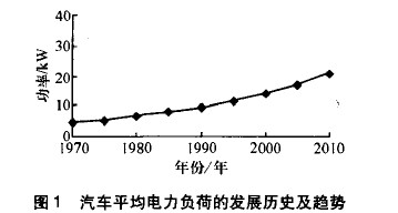 汽車電源的電壓從上世紀(jì)50年代的6V改為12V,己有50多年的歷史。自1990年開(kāi)始,汽車用電量每年以5%~8%的比例增加,其平均電力負(fù)荷的發(fā)展歷史與趨勢(shì)見(jiàn)圖1。隨著汽車技術(shù)的不斷進(jìn)步,將會(huì)有越來(lái)越多的電氣及電子系統(tǒng)被應(yīng)用到汽車上。