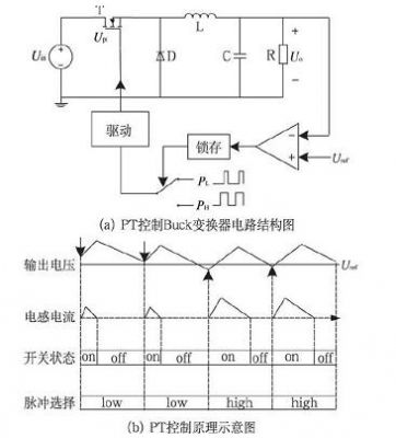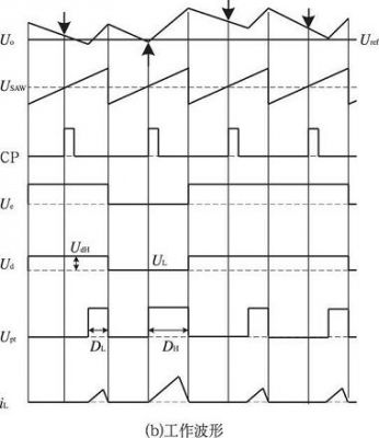 上述PT 控制器的工作過程為: 在開關(guān)周期的起始時(shí)刻, 時(shí)鐘信號(hào)CP 來臨, 若此時(shí)Uo > Uref , 則Ue 為高電平; 時(shí)鐘信號(hào)同時(shí)使觸發(fā)器D 觸發(fā), 觸發(fā)器輸出信號(hào)Ud 在下一時(shí)鐘脈沖來臨前保持高電平不變; 鋸齒波信號(hào)USAW 與Ud 經(jīng)過C2 比較, 輸出占空比為DL的低能量脈沖信號(hào)P L.若Uo< Uref , 則Ue 為低電平;觸發(fā)器輸出信號(hào)Ud 在下一時(shí)鐘脈沖來臨前保持低電平不變; 鋸齒波信號(hào)USAW 與Ud 比較產(chǎn)生占空比為DH的高能量脈沖信號(hào)PH .PT 控制器主要工作波形如圖2( b) 所示。