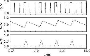 由圖3 可知, 輸出電壓Uo 的紋波隨著電感電流I L 的變化而變化??刂菩盘?hào)每輸出一個(gè)高能量脈沖,輸出電壓紋波值增大;輸出低能量脈沖時(shí), 輸出電壓紋波值減小, 但是其值始終在5 V 上下范圍內(nèi)波動(dòng)。仿真結(jié)果與實(shí)驗(yàn)設(shè)計(jì)要求一致。