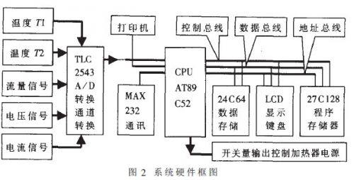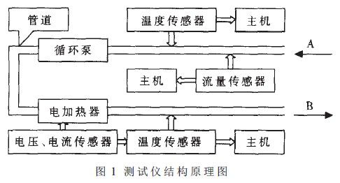 本儀器由流量傳感器、電流傳感器、電壓傳感器、溫度傳感器、泵、電加熱器;管道和主機(jī)等緩?fù)Y(jié)構(gòu)面匡如圖1所示。
