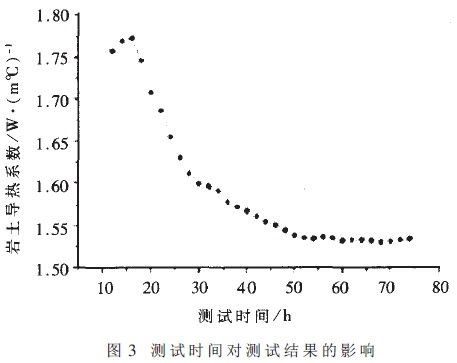 測(cè)試時(shí)間對(duì)測(cè)試結(jié)果的影響如圖3所示。由圖3可以看出,測(cè)試時(shí)間不同,計(jì)算出的鉆孔周圍地下巖土的平均導(dǎo)熱系數(shù)也不同。當(dāng)測(cè)試時(shí)間達(dá)到約50小時(shí)后,測(cè)出的導(dǎo)熱系數(shù)趨于穩(wěn)定,維持在1.530~1.538 W/m℃的范圍之間。通常測(cè)試時(shí)間可以選取60小時(shí)左右,這樣既可以保證獲得正確的導(dǎo)熱系數(shù),又可以避免測(cè)試時(shí)間過長(zhǎng)。