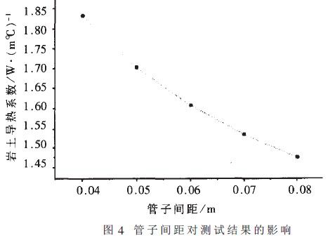 維持其它條件不變,只改變導(dǎo)管上升管與下降管之間的間距,其對(duì)巖土導(dǎo)熱系數(shù)的影響見圖4。當(dāng)管間距變化約為0.0lm時(shí).計(jì)算出的導(dǎo)熱系數(shù)變化約為4~8%。由圖中可以看出,間距越大,計(jì)算出的導(dǎo)熱系數(shù)越?。哼@是由于間距越大,鉆孔內(nèi)的熱阻越小,在總熱阻不變的情況下.周圍巖土的導(dǎo)熱熱阻大。即導(dǎo)熱系數(shù)小。因此如何確定管于間距是設(shè)計(jì)地源熱泵系統(tǒng)中值得認(rèn)真探討的問題。