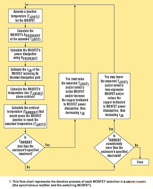 再參考圖1說明,確定是否正確選擇了用于同步整流器和開關MOSFET的MOSFET迭代過程的下一個步驟。這一步驟計算每個MOSFET的環(huán)境空氣溫度,它可能導致達到假設的MOSFET結(jié)溫。為此,首先要確定每個MOSFET的結(jié)與環(huán)境間的熱阻(ΘJA)。