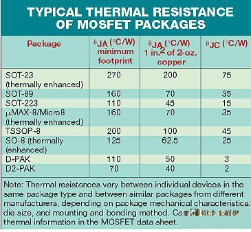 讓我們從MOSFET的ΘJA開始。對于單芯片SO-8 MOSFET封裝,ΘJA通常在62°C/W附近。對于其他封裝,帶有散熱柵格或暴露的散熱條,ΘJA可能在40°C/W和50°C/W之間(參見表)。計算多高的環(huán)境溫度將引起裸片達到假設的TJ(HOT):TAMBIENT=TJ(HOT)-TJ(RISE)