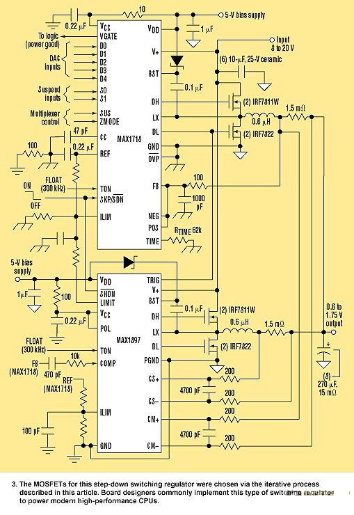 圖3所示CPU內(nèi)核電源在40A提供1.3V。兩個同樣的20A電源在300kHz運行,提供40A輸出電源。MAX1718主控制器驅(qū)動一個,而MAX1897從控制器驅(qū)動另一個。該電源輸入范圍在8~20V之間,指定封裝的最高工組作環(huán)境溫度60°C。