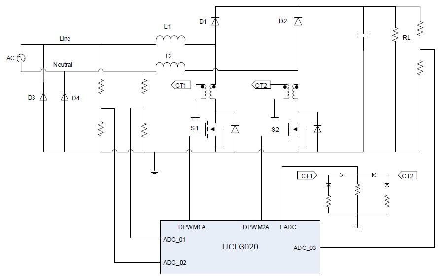 在其他無(wú)橋PFC拓?fù)浣Y(jié)構(gòu)中,圖1是一個(gè)已被業(yè)界廣泛采用的無(wú)橋PFC實(shí)例。它具有兩個(gè)DC/DC升壓電路,一個(gè)由L1、D1和S1組成,另一個(gè)則由L2、D2和S2組成。D3和D4為慢恢復(fù)二極管。通過(guò)參考內(nèi)部電源地,分別檢測(cè)線路(Line)和中性點(diǎn)(Neutral)電壓,測(cè)量得到輸入AC電壓。通過(guò)對(duì)比檢測(cè)到的線路和中性點(diǎn)信號(hào),固件便可知道它是一個(gè)正半周,還是一個(gè)負(fù)半周。在一個(gè)正半周內(nèi),第一個(gè)DC/DC升壓電路(L1-S1-D1)有效,并且升壓電流通過(guò)二極管D4回到AC中性點(diǎn);在一個(gè)負(fù)半周內(nèi),第二個(gè)DC/DC升壓電路(L2-S2-D2)有效,并且升壓電流二極管通過(guò)D3回到AC線。像UCD3020這樣的數(shù)字控制器用于控制這種無(wú)橋PFC。