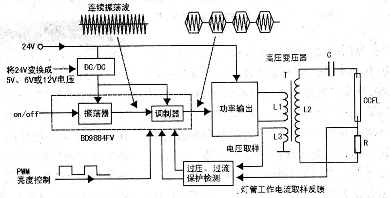 PWM調(diào)制信號(hào)改變輸出高壓脈沖的寬度,從而達(dá)到改變亮度的目的。在背光燈管點(diǎn)亮后,L2、C及燈管組合使高壓交流電正弦化(低Q值串聯(lián)諧振),電容C的容抗及L2的感抗對(duì)背光燈管又起到限流的作用。