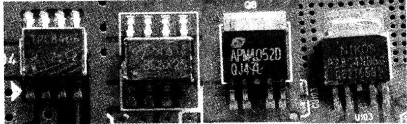 背光燈驅(qū)動(dòng)板主要由振蕩器、調(diào)制器、功率輸出電路及保護(hù)檢測(cè)電路組成,如1圖所示。在實(shí)際電路中,除功率輸出部分和檢測(cè)保護(hù)部分外,振蕩器、調(diào)制器及控制部分通常由一塊單片集成電路完成,這類集成電路常用的主要有BD(Rohm公司生產(chǎn),如BD9884FV、BD9766等)及OZ系列(凹凸微電子公司生產(chǎn),如02960、02964等);功率輸出管多采用互補(bǔ)的功率型場(chǎng)效應(yīng)管,有的采用3腳和8腳(①~③腳為S極,④腳為G極,⑤-⑧腳為D極)貼片封裝型,常見(jiàn)型號(hào)有D454、RSS085、D413、TPC8110、FDD6635.FDD6637等,如圖2所示;還有的采用由N溝道和P溝道組合的5腳或8腳MOSFET功率塊(①腳為Sl極,②腳為Gl極,③腳為S2極,④腳為G2極,⑤~⑧腳為D1、D2極),如SP8M3、TPC8406、4614、APM40520、P2804ND5G等,如圖3所示。保護(hù)檢測(cè)多由集成電路10393、358、393或LM324及其外圍元件來(lái)完成。輸出電路主要由高壓變壓器、諧振電容及背光燈管組成,并設(shè)有輸出電壓、輸出電流取樣電路?!?/p>