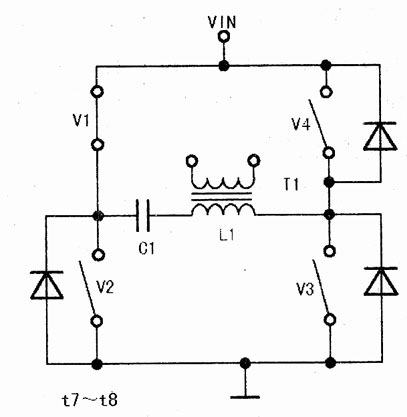 在t7~t8期間,V1導(dǎo)通,V2~V4截止,L1中無(wú)電流流過(guò),如圖21所示。
