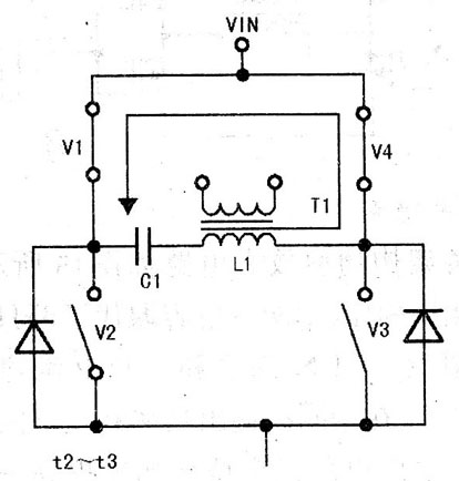 在t2~t3期間,V1、V4導(dǎo)通,V2、V3截止,L1與Cl諧振,Ll中儲(chǔ)存的電能通過(guò)Vl、V4給C1充電,流過(guò)Ll的電流逐漸減小,其電流回路如圖16所示。
