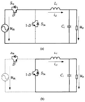 當開關管S1a開通、S2a關斷時,輸入電壓通過開關管S1a的反向二極管、電感Lf給電容Cf和負載供電,如圖3(a)所示;當開關管S1a斷開,S2a開通時,電感電流iLf經(jīng)Lf、開關管S2a、Cf和負載續(xù)流,Lf和Cf共同向負載供電,如圖3(b)所示。