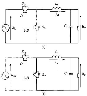 當開關管S1b開通、S2b關斷時,輸入電壓通過開關管S1b、電感Lf給電容Cf和負載供電,如圖4(a)所示;當開關管S1b斷開,S2b開通時,電感電流iLf經(jīng)Lf、開關管S2b的反向二極管、Cf和負載續(xù)流,Lf和Cf共同向負載供電,如圖4(b)所示。