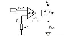 間接閉環(huán)控制環(huán)路如圖1所示,該控制環(huán)路包括一個誤差放大器,反饋環(huán)路和調(diào)整管(VMP管)。工作原理是由誤差放大器將輸出反饋電壓VFB與參考電壓Vref進行比較,并放大其差值(Vref-VFB)以此來控制調(diào)整管(VMP)的導通狀態(tài),實現(xiàn)負反饋,從而得到穩(wěn)定的輸出Vcon。電路剛啟動時,反饋電壓VFB很低,如果穩(wěn)壓器啟動時產(chǎn)生較大的電容(或者負載電容很大)或VMP管導通時有較小的電阻,浪涌電流(即流過VMP管的瞬間電流)就會很大,有時會接近穩(wěn)壓器的電流限值。因此,必須在誤差放大器中設(shè)計軟啟動電路,以保證整個電路在上電后進入正常的直流偏置狀態(tài),不會產(chǎn)生浪涌電流。
