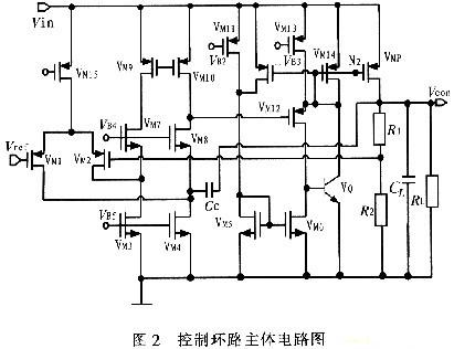 閉環(huán)控制系統(tǒng)的主體電路如圖2所示,VM1~VM8組成折疊式的誤差放大器,VM9~VM10組成單級的電流鏡作為負載,這樣做的好處就是采用10 pF左右的補償電容就可以使系統(tǒng)達到穩(wěn)定。VM5~VM14和VQ組成級間緩沖級。R1和R2組成反饋網(wǎng)絡(luò),其中