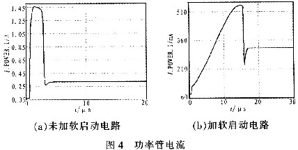 圖4為系統(tǒng)剛啟動時,流過功率管VMP管的電流,圖4(a)為沒有加軟啟動電路時,流過P功率管的瞬態(tài)電流,其峰值電流高達1.45 A。圖4(b)表明軟啟動電路分別從斜率和峰值成功地控制了瞬態(tài)電流,其峰值僅為520 mA,上升的斜率幾乎是一恒定值,不過這會增加系統(tǒng)的響應(yīng)時間。因此可以根據(jù)應(yīng)用系統(tǒng)的其他要求確定浪涌電流的斜率和峰值。