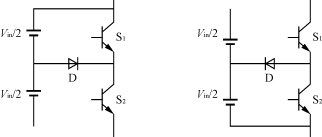 文獻(xiàn)[2]分析了三電平DC/DC變換器的推導(dǎo)過(guò)程:用兩只開(kāi)關(guān)管串聯(lián)代替一只開(kāi)關(guān)管以降低電壓應(yīng)力,并引入一只箝位二極管和箝位電壓源(它被均分為兩個(gè)相等的電壓源)確保兩只開(kāi)關(guān)管電壓應(yīng)力均衡。電路中開(kāi)關(guān)管的位置不同,其箝位電壓源與箝位二極管的接法也不同。文中提取出兩個(gè)三電平開(kāi)關(guān)單元如下圖1所示。圖1(a)中,箝位二極管的陽(yáng)極與箝位電壓源的中點(diǎn)相連,稱之為陽(yáng)極單元;圖1(b)中,箝位二極管的陰極與箝位電壓源的中點(diǎn)相連,稱之為陰極單元。