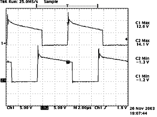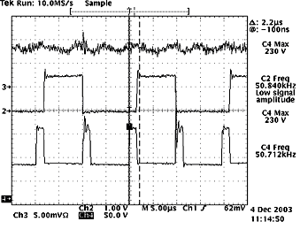 (b)圖中,示意了隔離變壓器副邊輸出的兩路驅(qū)動(dòng)波形,可以直接驅(qū)動(dòng)開(kāi)關(guān)管。從圖中可以看出驅(qū)動(dòng)波形比較理想:有快速的上升沿,并在一開(kāi)始有一定的過(guò)沖,可以加速開(kāi)通,減小了開(kāi)通損耗;同時(shí),有反偏截止電壓,提供了足夠的反相門(mén)極驅(qū)動(dòng),減小了下降時(shí)間;很好地驗(yàn)證了驅(qū)動(dòng)電路的設(shè)計(jì)是合理的。