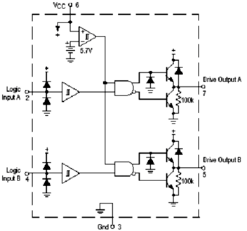 MC34152的外圍電路簡(jiǎn)單,應(yīng)用方便。它是8管腳的同相推挽驅(qū)動(dòng)芯片,具體的內(nèi)部結(jié)構(gòu)和封裝如圖4所示。2,4腳為兩路控制信號(hào)輸入,經(jīng)過(guò)芯片內(nèi)部的推挽放大,直接輸出同相的兩路驅(qū)動(dòng)信號(hào)(7,5腳)。為使芯片更加穩(wěn)定地工作,一般在芯片的電源端并聯(lián)一個(gè)濾去高頻干擾的瓷片電容和一個(gè)濾去低頻干擾的電解電容。