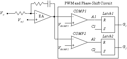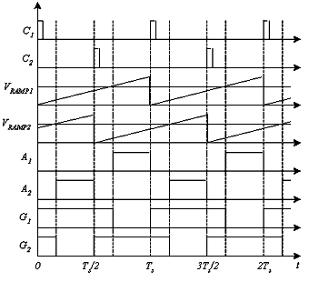 如圖3所示,時(shí)鐘信號(hào)C1和C2相差180度,它們分別對(duì)應(yīng)的鋸 VRAMP1 和 VRAMP2 也相差180度,電壓誤差放大器的輸出信號(hào) VEA、Vo 分別與 VRAMP1 和 VRAMP2 相比較,再通過(guò)兩個(gè)RS觸發(fā)器得到相差180度的驅(qū)動(dòng)信號(hào) G1 和 G2 。