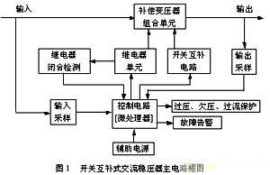 本穩(wěn)壓器由補償變壓器組合單元、繼電器單元、開關(guān)互補電路、控制電路、過欠壓以及過流保護及故障告警電路、輔助電源等部分組成,整機框圖如下:
