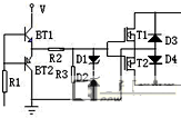 關(guān)互補電路實際上是繼電器的一個旁通電子開關(guān),采用兩只IGBT、兩只二極管構(gòu)成的交流通路,是互補式交流穩(wěn)壓器的主要技術(shù)點,電路如圖3: