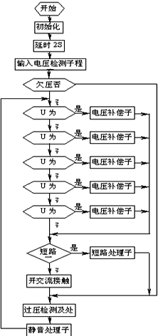 系統(tǒng)接通市電,合上電源開關(guān)后,單片機進行初始化,延時2秒后,進行輸入電壓檢測,若輸入電壓在允許范圍內(nèi),則根據(jù)電壓值進行相應(yīng)的電壓補償,否則補償電路不進行任何動作,但要相應(yīng)的聲光告警;電壓調(diào)整完畢達到輸出標(biāo)準(zhǔn)后,自動合上輸出交流接觸器,系統(tǒng)正常輸出。此時,單片機對輸出電壓進行過壓檢測,一旦輸出電壓過高,則切斷輸出,以防輸出電壓過高而影響負(fù)載工作,在電壓恢復(fù)正常后,自動合閘,輸出電壓。單片機還對輸入電壓進行實時檢測,只要市電發(fā)生變化,就進入相應(yīng)的電壓補償子程序,對補償電壓進行調(diào)整。其流程圖見圖5。