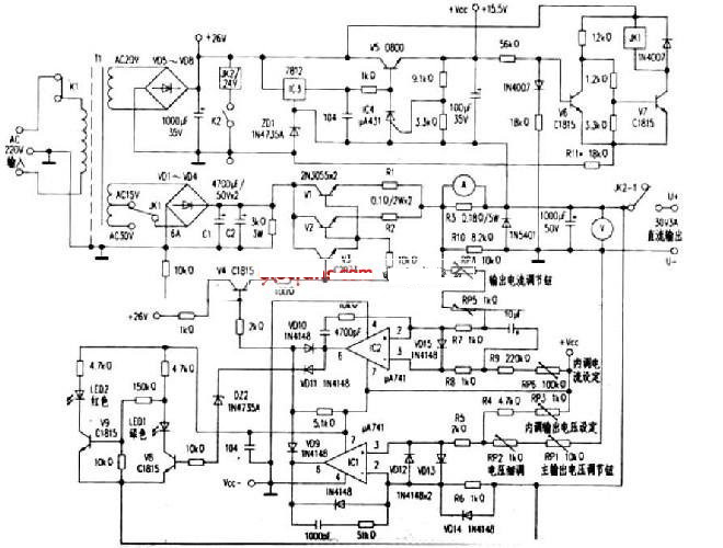 運放IC1(μA741)及周邊元件組成穩(wěn)壓調(diào)節(jié)電路,由V1//V2、V3組成達林頓大功率電壓調(diào)整電路。RPl、RP2、RP3、R4、R5、R6、VDl2、VD13、VDl4等組成輸出電壓取樣電路,運放IC1對輸出電壓變化進行放大,由輸出端⑥腳經(jīng)VD10對達林頓管的基極電流進行分流,以達到穩(wěn)壓調(diào)整目的,其中RP1、RP2為面板上的輸出電壓粗細調(diào)節(jié)電位器,RP3為電路板內(nèi)部的最高輸出電壓設(shè)定可調(diào)電阻。