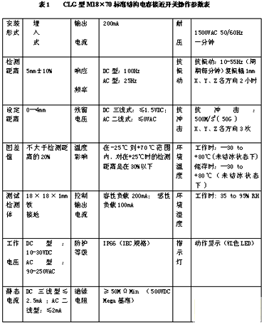 電容式接近開關(guān)屬于一種具有開關(guān)量輸出的位置傳感器,它的測(cè)量頭通常構(gòu)成電容器的一個(gè)極板,而另一個(gè)極板是物體的本身,當(dāng)物體移向接近開關(guān)時(shí),物體和接近開關(guān)的介電常數(shù)ε發(fā)生變化,使得和測(cè)量頭相連的電路狀態(tài)也隨之發(fā)生變化,由此便可控制開關(guān)的接通和關(guān)斷。被這種接近開關(guān)的檢測(cè)物體,并不限于金屬導(dǎo)體,也可以是絕緣的液體或粉狀物體,在檢測(cè)較低介電常數(shù)ε的物體時(shí),可以順時(shí)針調(diào)節(jié)多圈電位器(位于開關(guān)后部)來增加感應(yīng)靈敏度,一般調(diào)節(jié)電位器使電容式的接近開關(guān)在0.7-0.8Sn(Sn為電容式接近開關(guān)的標(biāo)準(zhǔn)檢測(cè)距離)的位置動(dòng)作。這里選用的是浙江省洞頭縣光電開關(guān)廠生產(chǎn)的CLG型M18×70標(biāo)準(zhǔn)結(jié)構(gòu)的開關(guān)。它的外型圖與尺寸標(biāo)示圖分別如圖1與圖2所示。