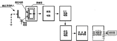 系統(tǒng)組成框圖如圖3所示,從框圖可以看出控制信號(hào)的流程:當(dāng)人或其它物體接近電容式接近開關(guān)時(shí),等效電容的容量值會(huì)發(fā)生變化,從而改變LC振蕩器的振蕩頻率,F(xiàn)/V電路將LC振蕩器輸出的頻率量轉(zhuǎn)化成電壓量后,交給信號(hào)處理電路,該部分將電壓信號(hào)進(jìn)行一系列的處理(包括:放大、整形等)后傳給開關(guān)量變換電路,開關(guān)量轉(zhuǎn)換電路實(shí)際上是A/D轉(zhuǎn)換器,它將模擬電壓轉(zhuǎn)換為數(shù)字量,水龍頭控制電路由開關(guān)量轉(zhuǎn)換電路的輸出量控制,它產(chǎn)生控制信號(hào)控制水龍頭的開與關(guān)。本系統(tǒng)設(shè)計(jì)成當(dāng)人接近水龍頭一定距離時(shí),水龍頭自動(dòng)開啟,離開一定距離后水龍頭自動(dòng)關(guān)閉。