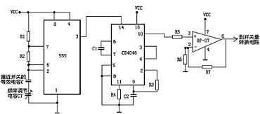 連線圖如圖4所示,由555定時(shí)器組成的振蕩器,它的振蕩頻率為:f=1/0.69*(R1+2*R2)*(C//CT),C就是電容式接近開關(guān)的等效電容值,CT為頻率調(diào)節(jié)電容,通過C的變化從而使振蕩頻率變化,將此種變化傳給F/V電路,引起F/V電路的輸出電壓變化。由鎖相環(huán)CD4046組成的F/V變換電路將頻率值變成電壓值后,經(jīng)精密運(yùn)放OP-07線性放大后輸入到開關(guān)量轉(zhuǎn)換器(A/D轉(zhuǎn)換器)的輸入端。