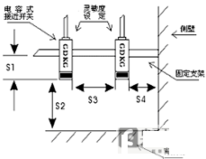 安裝要求示意圖如圖5所示,圖中S1表示檢測(cè)面與支架的間距,要求≥1Sn,S2表示檢測(cè)面與背景的間距,要求≥3Sn,S3表示并列安裝間距,要求≥5Sn,S4表示檢測(cè)面與側(cè)壁的間距,要求≥3Sn。(Sn為電容式接近開關(guān)的標(biāo)準(zhǔn)檢測(cè)距離)