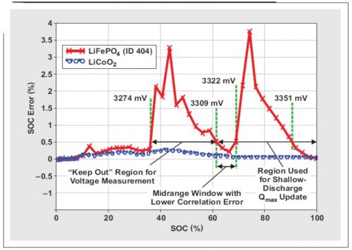 如表 1 所示,化學(xué) ID 404 的 OCV 測量的不合格電壓范圍為 3274mV(最小值,即 ~34% SOC)到 3351mV(最大值,即 ~93% SOC)。大多數(shù)磷酸鐵鋰電池都有非常寬的不合格電壓范圍(參見化學(xué) ID 409 進(jìn)行對比)。然而,根據(jù)具體的電池特性,為淺放電 Qmax 更新找出一個更高的最小不合格電壓是可能的?;瘜W(xué) ID 為 404 時,將這一值升高至 3322mV 是可能的,從而允許 3309 到3322 mV 的淺放電 Qmax 更新窗口(請參見圖 2)。設(shè)計人員可以使用這種中間范圍低誤差窗口,實現(xiàn)數(shù)據(jù)閃存修改。由于僅能對高和低不合格電壓范圍進(jìn)行設(shè)定,因此主系統(tǒng)必須保證在 3309mV 以下不會進(jìn)行更低的 OCV 測量。(隨著關(guān)聯(lián)誤差的增長,OCV 測量誤差在 3274 和 3309mV 之間急劇增加。)雖然僅有一個 13-mV 窗口在更低 OCV 測量時起作用(3322 – 3309 mV = 13 mV),但其對應(yīng)于一個 70% 到 64% 的 SOC 范圍。