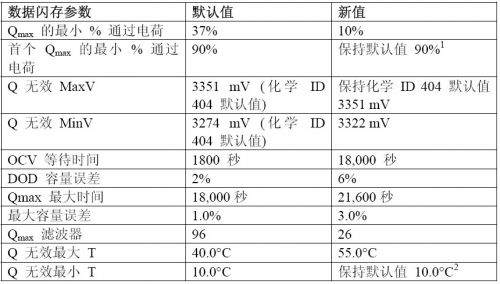 磷酸鐵鋰電池具有非常長的松弛時間,因此我們可以將數(shù)據(jù)閃存參數(shù)“OCV 等待時間”增加至 18000 秒(5 小時)。由于電池的正常工作溫度得到提高,因此參數(shù)“Q 無效最大溫度”應(yīng)修改為 55°C。另外,“Qmax 最大時間”應(yīng)修改為21600 秒(6 小時)。