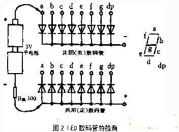 LED數(shù)碼管外觀要求顏色均勻、無局部變色及無氣泡等,在業(yè)余條件下可用干電池進一步檢測。如圖2所示。以共陰極數(shù)碼管為例介紹檢測方法。;將3;V干電池負極引出線固定接觸在LED數(shù)碼管的公共陰極上,電池正極引出線依次移動接觸筆畫的正極端。這一根引出線接觸到某一筆畫的正極端時,那~筆畫就應顯示出來。用這種簡單的方法就可檢測出數(shù)碼管是否有斷筆(某筆畫不能顯示),連筆(某些筆畫連在一起),并且可相對比較出不同的筆畫發(fā)光的強弱性能。若檢測共陽極數(shù)碼管,只需將電池正負極引出線對調(diào)一下,方法同上。