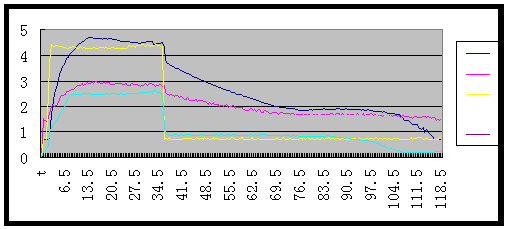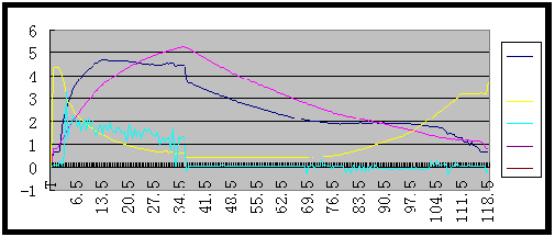 圖5為汽車速度從零加到120KM/H后又由120KM/H減到零時,位置傳感器與輸入軸轉(zhuǎn)速、輸出軸轉(zhuǎn)速和電機電壓之間的關(guān)系曲線。由圖可知,當(dāng)汽車速度在從零加到120KM/H過程中,位置傳感器變比由最大開始下調(diào)直到變?yōu)樽钚?,此時對應(yīng)電機反轉(zhuǎn)。當(dāng)車速由120KM/H開始下降時位置傳感器先保持不變,此時電機不轉(zhuǎn),同時輸入軸轉(zhuǎn)速和輸出轉(zhuǎn)速成比例的下降,當(dāng)車速達到一定的值時位置傳感器速比由最小開始上調(diào)直到為最大值,此時電機反轉(zhuǎn)(因測試時采用的電流傳感器為單方向的,所以圖中沒有反映出反向電流)。輸入軸轉(zhuǎn)速和輸出軸轉(zhuǎn)速不成比例的下降直至為零。從圖5可以看到車速在上升時,位置傳感器速比的測試值不斷地減?。▽?yīng)的轉(zhuǎn)速比增大)。反之,車速在下降的過程中,當(dāng)車速小于某一值時測試值增加。從而實現(xiàn)了變速箱變比的自動調(diào)整。