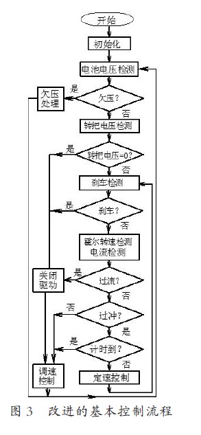根據(jù)上述思路將軟件控制流程進(jìn)行修改。如圖3 所示。將“速度增大而電流不增”作為“過(guò)沖”的判斷依據(jù)??刂破鞒掷m(xù)檢測(cè)速度變化和電流變化,再經(jīng)過(guò)判斷,如果不屬于“過(guò)沖”的情況,則執(zhí)行子程序“調(diào)速控制”。這種情況下控制器檢測(cè)轉(zhuǎn)把電壓值來(lái)調(diào)整PWM,增大或減小電流值使速度變化直至達(dá)到操作者通過(guò)轉(zhuǎn)把設(shè)定的速度值。