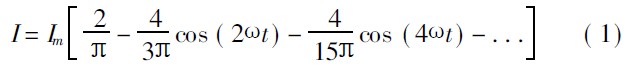 從上式可以看出, I 除了一直流分量之外, 還包含一系列的高頻諧波的交流分量(如圖2 所示波形)。這樣不但影響了電源線(xiàn)上的電流, 并使電流發(fā)生畸變, 同時(shí)也產(chǎn)生射頻干擾。