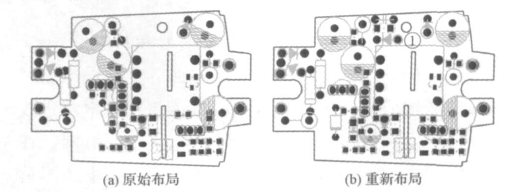 從圖4中可以看出在2 MH z頻率點(diǎn)附近最大超出為5 dBuV.為保證能夠順利通過(guò)認(rèn)證機(jī)構(gòu)的實(shí)驗(yàn)室測(cè)試, 一般要求預(yù)測(cè)試結(jié)果比標(biāo)準(zhǔn)限制低2 dBuV,希望盡量能夠比標(biāo)準(zhǔn)限值低6 dBuV.所以從圖4可知該產(chǎn)品的預(yù)測(cè)試結(jié)果并不理想。初步分析測(cè)試圖,可能性最大的原因是開(kāi)關(guān)管工作時(shí)產(chǎn)生的干擾把2MH z頻率點(diǎn)附近的噪聲電平底部懸空, 從而把傳導(dǎo)干擾的電平抬高。而在傳導(dǎo)發(fā)射測(cè)試中, 1 MH z~2MH z的頻率信號(hào)干擾是由共模電流產(chǎn)生的占主要分量[ 10] .所以初步定性為電流回路對(duì)參考地形成的干擾信號(hào)。為了能夠一次性解決問(wèn)題以達(dá)到標(biāo)準(zhǔn)限值要求, 把可能出現(xiàn)問(wèn)題的地方都加以改進(jìn), 本研究提出了解決方案: ①按照上述措施對(duì)線(xiàn)路板進(jìn)行重新布局, 原始布局如圖5( a)所示, 圖中布局雖然按照主電流流向排布, 但缺乏考慮各個(gè)子路之間的相互關(guān)系。重新布局如圖5( b)所示, 在無(wú)法改變PCB板的結(jié)構(gòu)下, 盡可能地將器件排列整齊, 方向一致, 同時(shí)增大開(kāi)關(guān)管與變壓器之間距離。② 變壓器初級(jí)增加并聯(lián)旁路濾波電容, 并聯(lián)電容值為1 000 pF /1 kV, 用來(lái)降低干擾信號(hào)對(duì)共模電流回路產(chǎn)生的影響。
