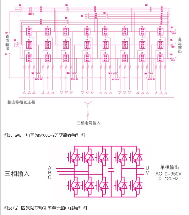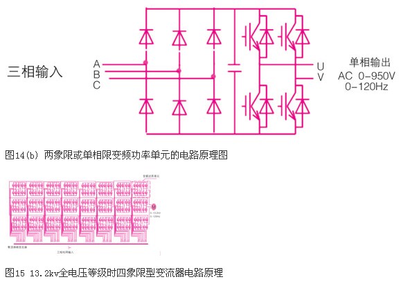 圖14(b)中,此變頻功率單元基本拓撲結(jié)構(gòu)為交椫睏交型三相二極管不可控整流/單相逆變輸出的電壓源型變頻器,即此變頻單元是三相交流輸入,單相輸出為可控的交流0~950v。其中逆變器件可以是igbt(igct、iegt)。